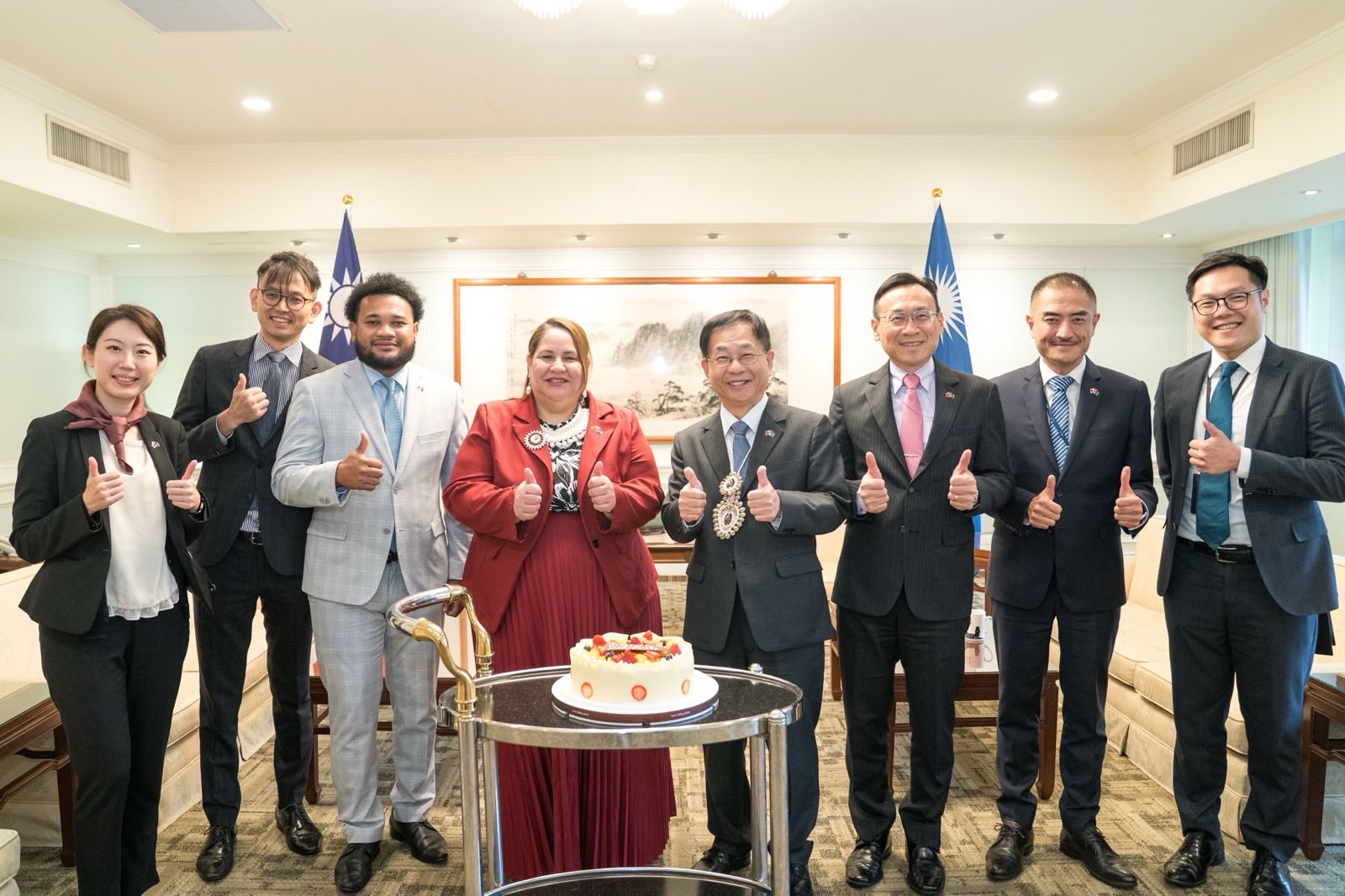 Vice Minister of Foreign Affairs Baushuan Ger met with Marshall Islands Ambassador to Taiwan Anjanette Kattil on the afternoon of November 20 at the Ministry of Foreign Affairs (MOFA) to celebrate the 27th anniversary of Taiwan-Marshall Islands diplomatic relations. Ambassador Kattil thoughtfully prepared a cake to share with Vice Minister Ger and MOFA colleagues. The atmosphere was warm and friendly.